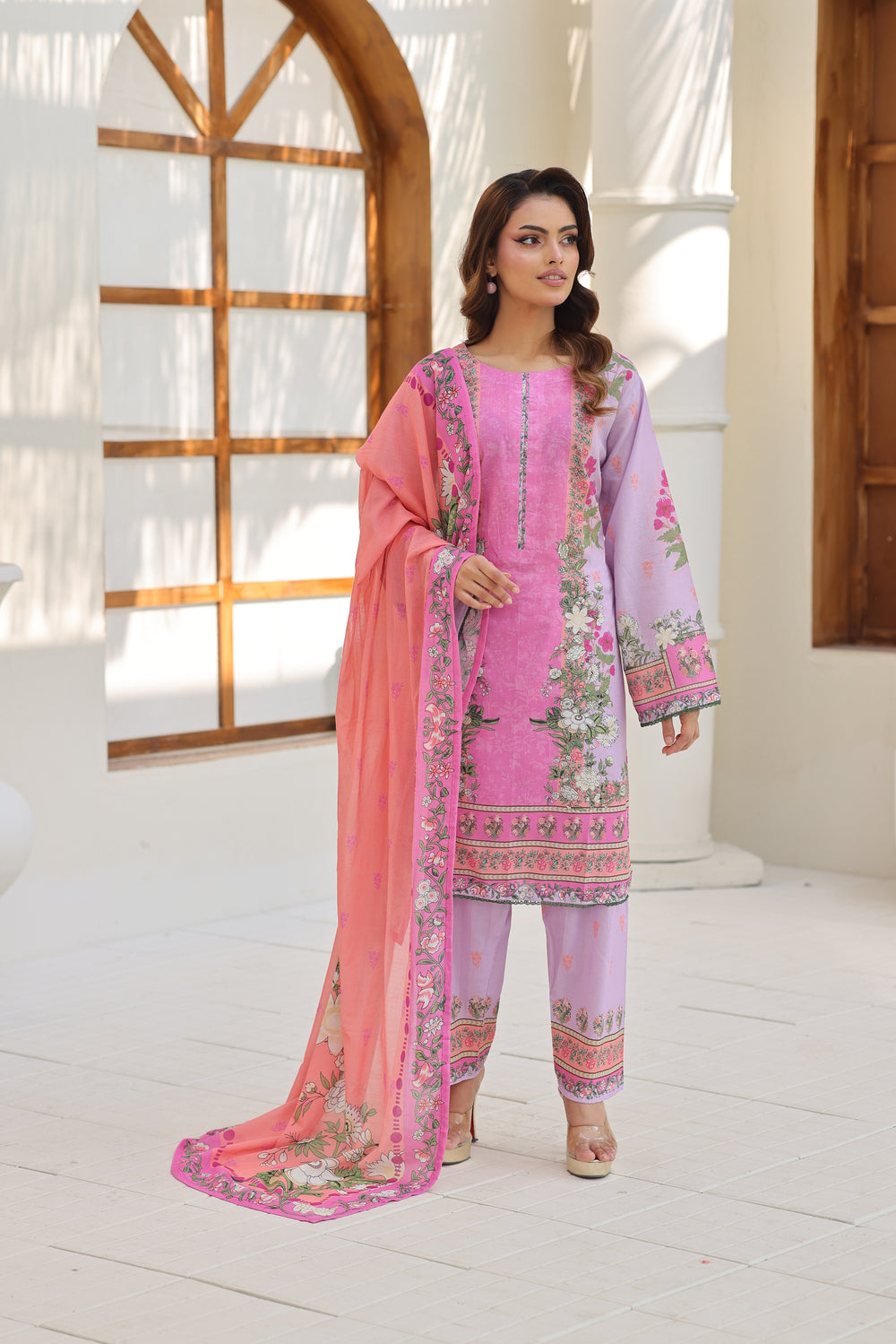 Zunaira Zamal Unstitched Printed Lawn 3-Piece Suit crafted in feather-light premium lawn, featuring a delicately printed shirt with floral motifs in soft lilac and pink hues. The design is complemented by a gracefully printed dupatta with an elegant border flow and a coordinated trouser panel that completes the look. Ideal for warm summer days, casual gatherings, and daytime wear, this unstitched ensemble offers breathable comfort, tailoring flexibility, and refined feminine charm.