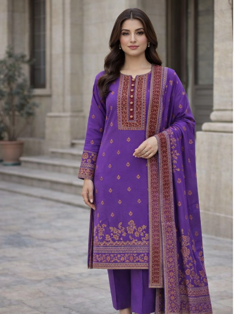ZUNAIRA ZAMAL Unstitched Jacquard 3-Piece is a regal composition crafted for refined festive dressing. The shirt features a rich royal purple jacquard base adorned with intricate woven motifs and an ornate neckline panel in antique gold and maroon tones. Complemented by a matching jacquard dupatta with detailed woven borders and a coordinated dyed cambric trouser, this ensemble reflects timeless craftsmanship with modern elegance.