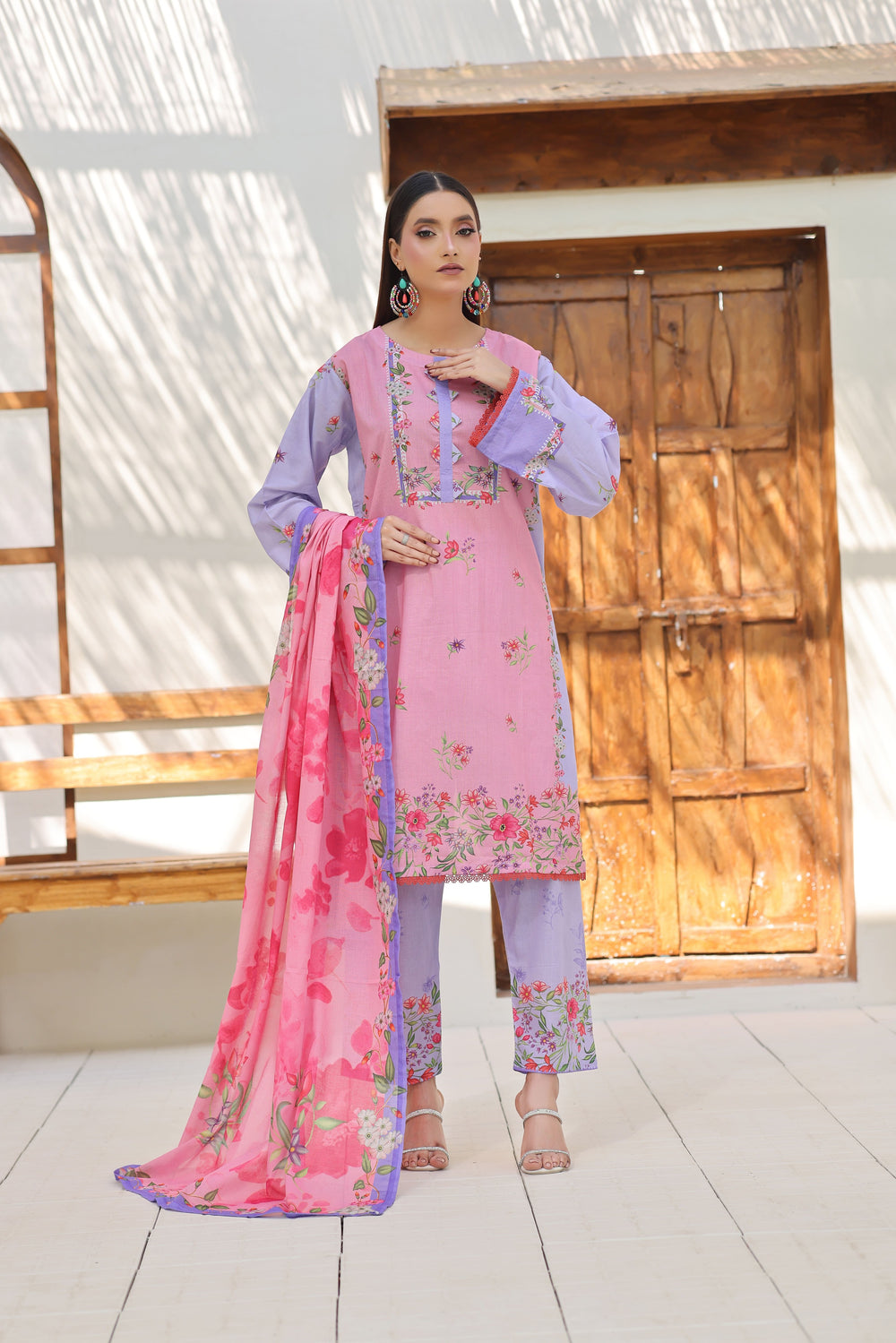 ZUNAIRA ZAMAL Unstitched Printed Lawn 3-Piece is a delicate blend of soft blush pink and soothing lilac tones, designed for an effortlessly elegant summer look. The printed lawn shirt features fine floral motifs with graceful borders, complemented by a flowy printed dupatta in deeper pink hues and a coordinated lilac trouser panel. Light, breathable, and refined, this design is ideal for warm days, casual wear, and daytime occasions, offering complete freedom to tailor according to your personal style.