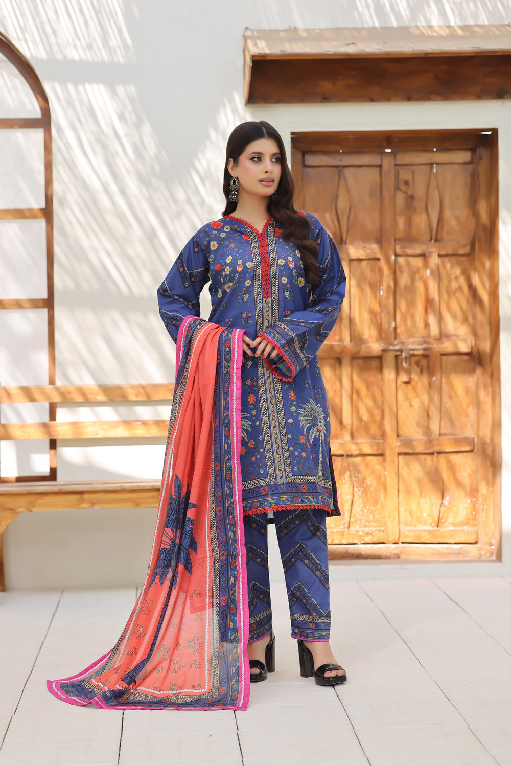 ZUNAIRA ZAMAL Unstitched Printed Lawn 3-Piece is a bold yet elegant composition inspired by traditional motifs and refined craftsmanship. The deep blue printed lawn shirt features intricate floral and border detailing, beautifully complemented by a striking coral-peach printed dupatta with contrasting borders. The coordinated printed lawn trouser completes the look, making it ideal for summer wear, casual gatherings, and daytime occasions. Designed for breathable comfort and effortless tailoring, this ensemble allows you to style it your way with grace and confidence.