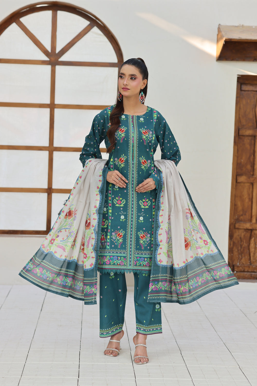 Printed lawn dupatta with a soft ivory base accented by floral motifs and framed with a contrasting emerald green border, adding elegance and balance to the ensemble.